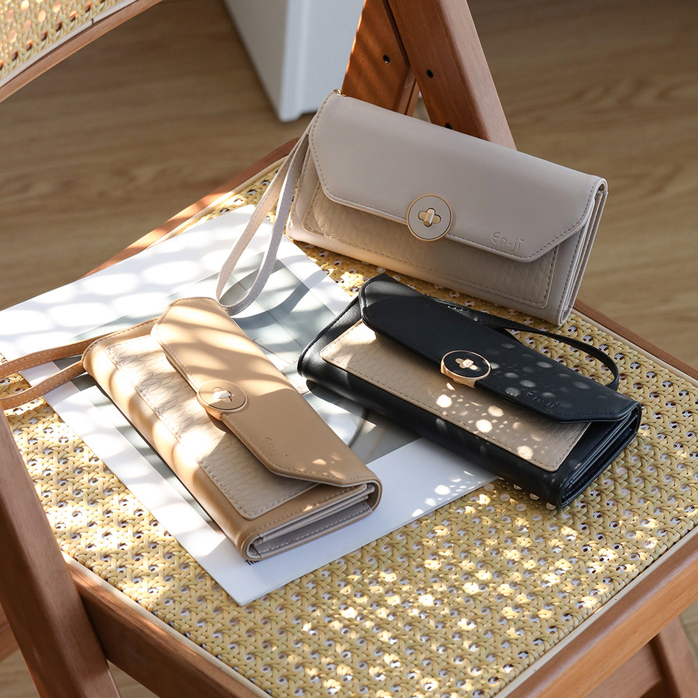 Long wallet yang chic hadir dengan morif emboss dibagian depan yang auto eye-catching. Lengkap dengan hand strap yang muat dipergelangan tangan super praktis & ready untuk nemenin kamu shopping or hangout nih girls. Kuni wallet punya multi slot yang super organized muat untuk simpan uang cash, card hingga smartphone tanpa softcase lho girls. Tampil dengan 3 kombinasi warna; black, cream & khaki. Let’s pair Nosu wallet with Kimsun shoulderbag, and prepare to be the center of attention!